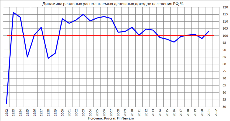 Динамика реальных располагаемых денежных доходов населения РФ по годам